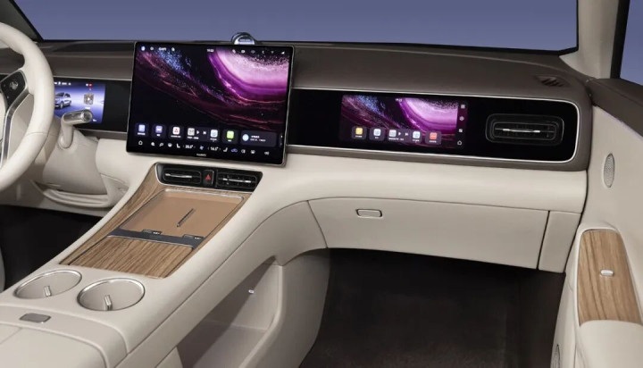 全新问界M7搭载全新16.1英寸3K悬浮中控屏,并全新搭配26英寸WHUD抬头显示系统,高配版还有68英寸AR-HUD,驻车状态下三指左滑即可秒变私人影院。